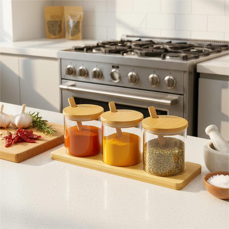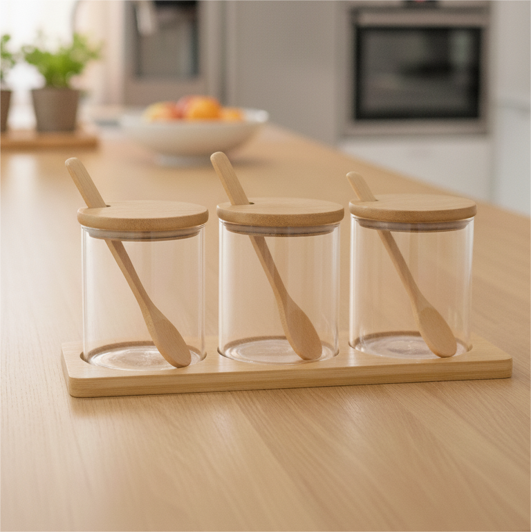 Set de Condimenteros x3: 🧂 🥫 ✨ Tres frascos organizadores ideales para tener tus especias básicas siempre a mano y protegidas de la humedad. Su diseño transparente permite identificar rápidamente el contenido para que no pierdas ni un segundo mientras cocinas.