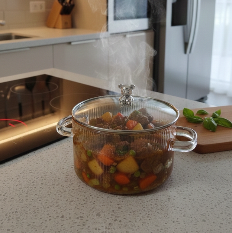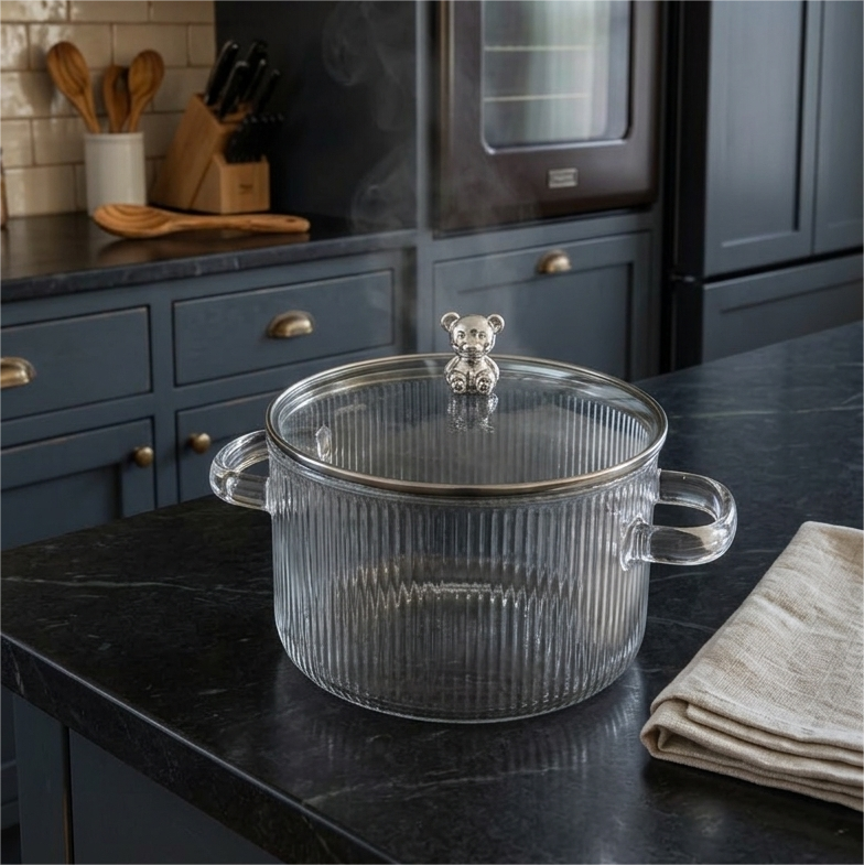 Olla con Adorno (1.5L) 💎 ✨ 🎀: Una olla pequeña y sofisticada que incluye un detalle decorativo en la tapa para darle un toque especial a tu cocina. Es el tamaño ideal para porciones individuales o salsas que requieren un control visual constante gracias a su transparencia